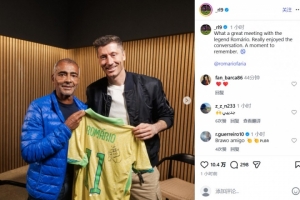 巴萨前锋莱万显然对和罗马里奥会面非常兴奋,他在社交媒体上晒出了两人的合照并写道:与传奇球星罗马里奥的会面真是太棒了!我们的对话非常愉快,这真是一个难忘的时刻。