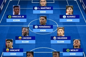 南美洲最贵首发11人:巴尔韦德、维尼修斯、小蜘蛛、劳塔罗领衔